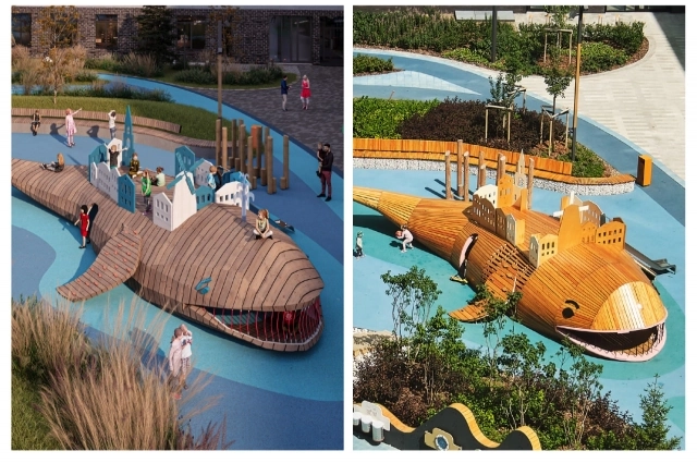 Знаменитая по сказкам рыба-кит в одном из дворов ЖК полюбилась детям и родителям. Это не просто арт-объект, а часть детской площадки: внутри – зона отдыха с гамаками, сбоку – горка, а на спине – «город» для тематических игр.