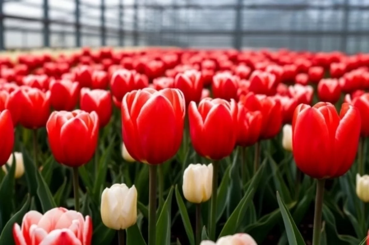 К 8 Марта в садовом центре Плодовое под Тюменью подготовили крупную партию весенних цветов — около 300 тысяч тюльпанов. Выращены как привычные классические сорта, так и махровые, всего представлено более двух десятков оттенков. Помимо тюльпанов, здесь также разводят нарциссы.