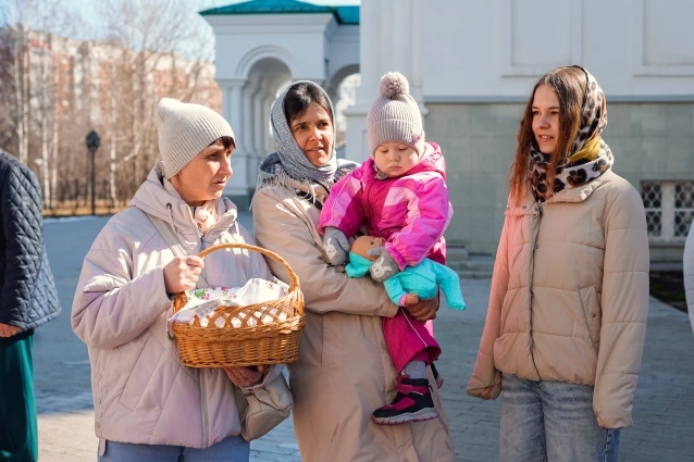 В этом году тюменцам повезло больше, в воскресенье на улице стояла теплая и солнечная погода. Люди приносили с собой праздничную выпечку, творожные пасхи и яйца, выстраиваясь в очередь у храма. Атмосфера была спокойной и по-настоящему весенней: звучали молитвы, священнослужители окропляли принесенные угощения святой водой, а также угощали детей и взрослых конфетами и куличами.
