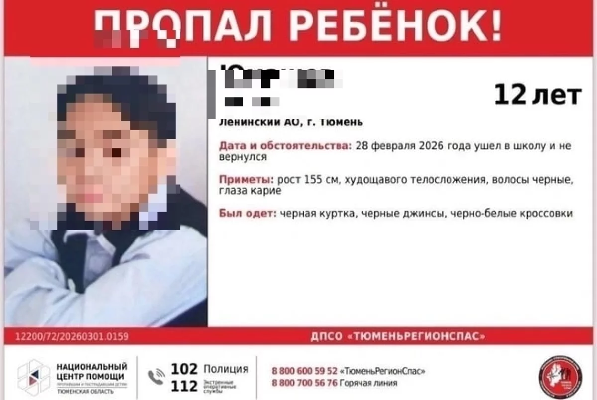 В Тюмени ищут несовершеннолетнего Ислама Юмашева. По информации Тюмень Регион Спас, 12-летний мальчик (2013 года рождения) пропал 28 февраля 2026 года. Ребенок ушел в школу, но домой так и не вернулся, его местонахождение до сих пор остается неизвестным.